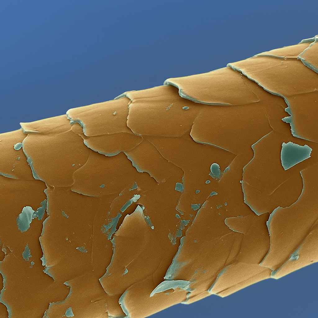 Коли волосся пересушене або пошкоджене, лусочки піднімаються надмірно, втрачають щільність прилягання - через це волосся стає жорстким, слабшим, втрачає вологу та блиск.